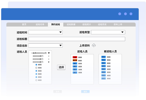 預(yù)約巡檢界面主要用來預(yù)約巡檢會議,在該頁面填寫巡檢時(shí)間、巡檢類型、巡檢標(biāo)題、項(xiàng)目名稱以及選擇巡檢人員和被巡檢人員,并上傳本次巡檢的流程資料。